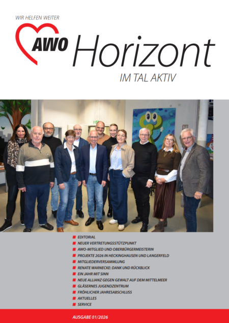 AWO Horizont 01/2026 als PDF herunterladen Liebe Freundinnen und Freunde, als neuer Vorsitzender des AWO Kreisverbandes Wuppertal grüße ich Sie zum ersten Mal von dieser Stelle. Zunächst möchte ich mich bei Renate Warnecke für ihr langes und unermüdliches Engagement für unseren Wohlfahrtsverband und die Menschen in unserer Stadt bedanken. Ich bin froh, dass sie von […]