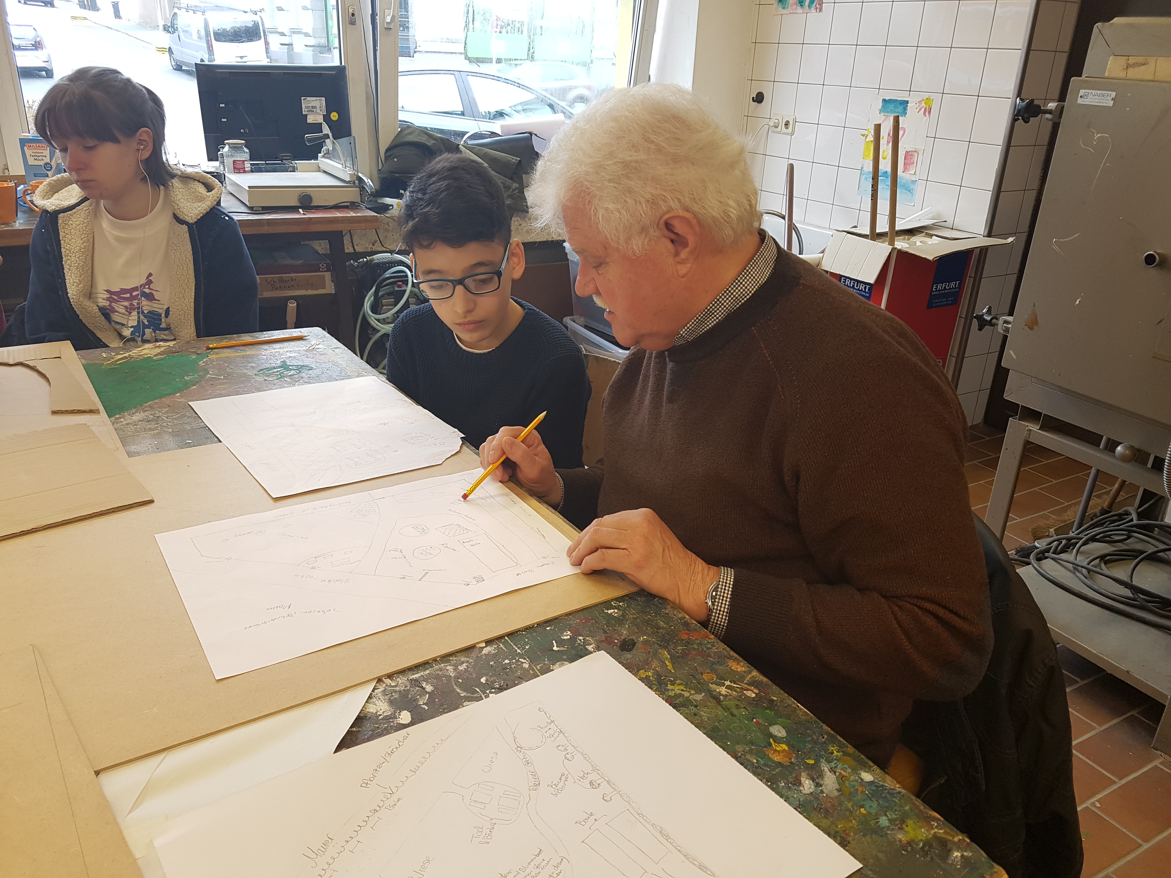 Nachmittags machten sich die Teilnehmenden mit Unterstützung des Architekturstudenten Guiseppe Guadagnano an die Gestaltung von Platzmodellen. Hierbei entwickelte sich direkt ein guter Austausch zwischen den Jugendlichen und Senioren, sodass diese gemeinsam an den Modellen arbeiteten. „Basteln kann ich nicht so gut, aber mit Sofian (Jugendlicher des Stadtteiltreffs) habe ich einen guten Partner für die Erstellung des Platzmodells gefunden“ so Manfred Schneider, Mitglied der ZWAR-Gruppe Heckinghausen.
